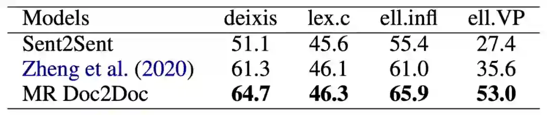 除 BLEU 外,研究者也证实了多分解度篇章到篇章的训练也能提升篇章翻译在具体语言学指标中的上下文一致性,如表 4 所示。