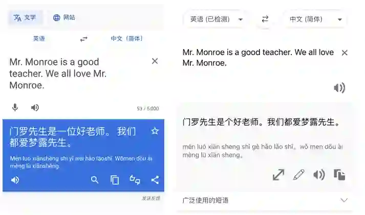 人类在翻译的过程中会保持上下文一致,比如翻译英文名「Monroe」,不会一会儿翻译成「梦露」,一会儿翻译成「门罗」,但许多商用机器翻译仍然会犯这种「低级错误」。