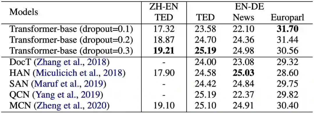 篇章翻译最常用的数据集是 News Commentary 与 TED Talks。这两份数据集仅包含大概 20 万句对,不到 1 万篇文档,而且测试集与训练集分布高度类似,有很高的过拟合的嫌疑。甚至有些工作 [5,6,7] 对句级别模型设定 dropout=0.1,篇章级别模型设定 dropout=0.2,并在此基础上宣称取得了提升。而其中可能潜在的正则化与过拟合的问题未被真正探讨过。