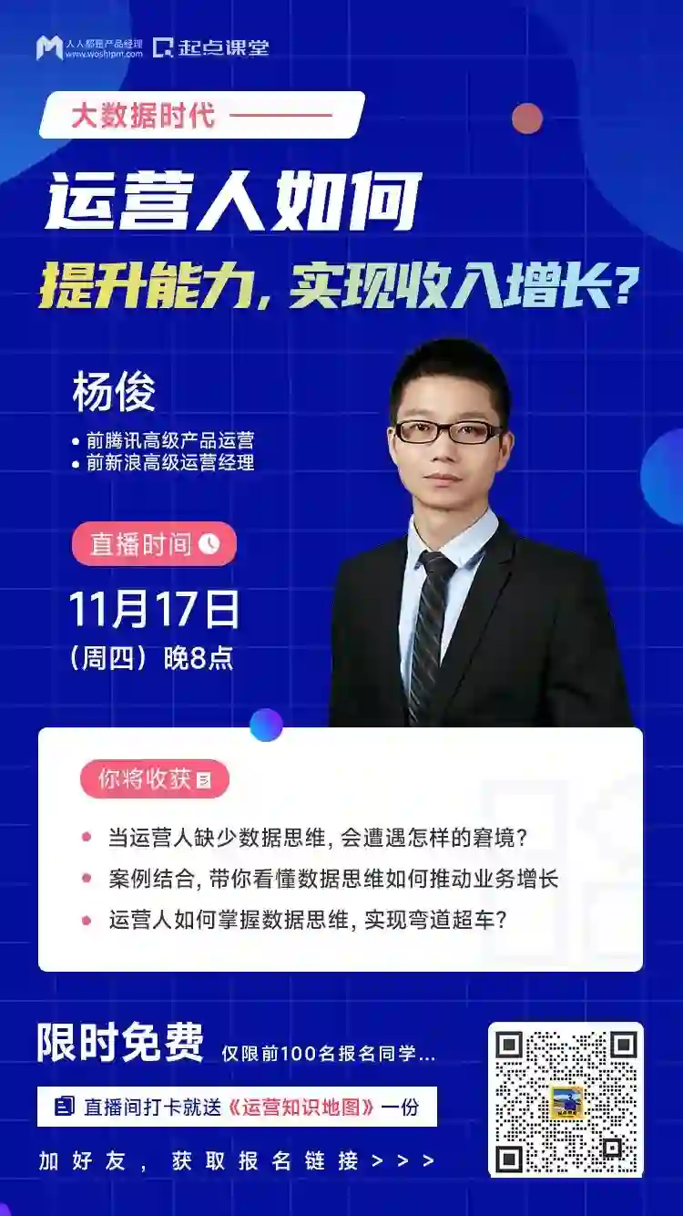 11月17日(周四)晚8点直播公开课上,从事互联网运营工作16年的杨俊老师,将为你进行详细讲解!