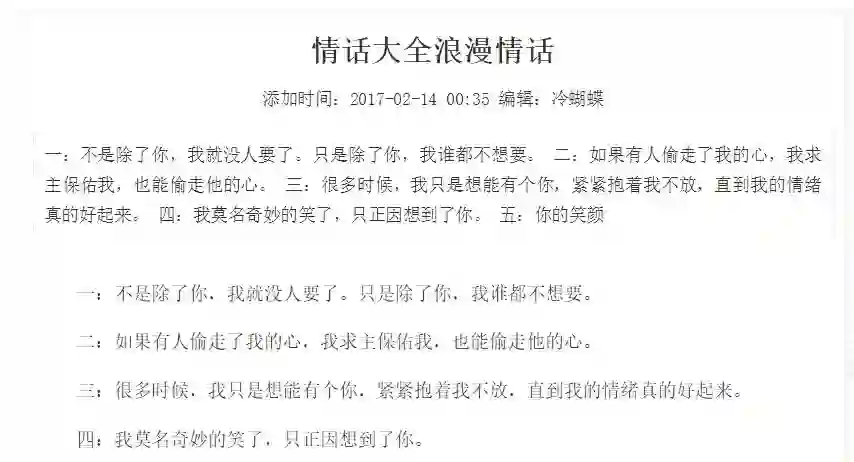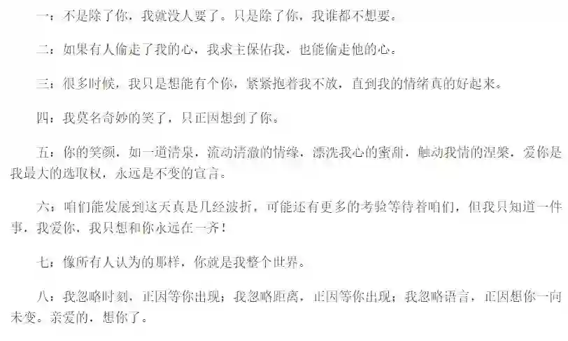 如果对你的文笔有信心,那你可以自己写些情话。当然大部分人的文笔跟我一样是比较差的,所以这时候我们就可以利用网上的资源,比如下面的情话网站。