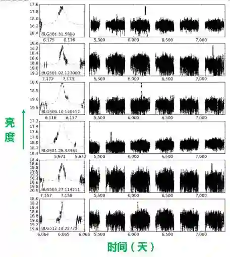 引人注目的是,OGLE同时还公布了6个时标短于0.4天的微引力透镜事件(如图6所示),这些事件被认为是由1到10个地球质量的流浪行星引起的。OGLE文章的第一作者Mroz认为:“由于OGLE对如此短时标事件的探测灵敏度非常低,因此,‘流浪地球’在宇宙中应该相当普遍,可能超过了恒星的数目。”[5]