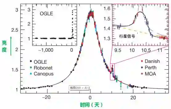 ► 图4. 太阳系外行星系统OGLE-2005-BLG-390L的一次微引力透镜事件。不同颜色的点代表不同望远镜及波段数据,黑线为最佳拟合结果,左上角方框内是该事件OGLE长达5年的数据,右上角方框内是对行星信号区域的放大。分析结果表明,该恒星系统里存在着一颗约5.5倍地球质量的行星,这也是发现的第一颗系外岩石行星(图片来源:文献[1])。