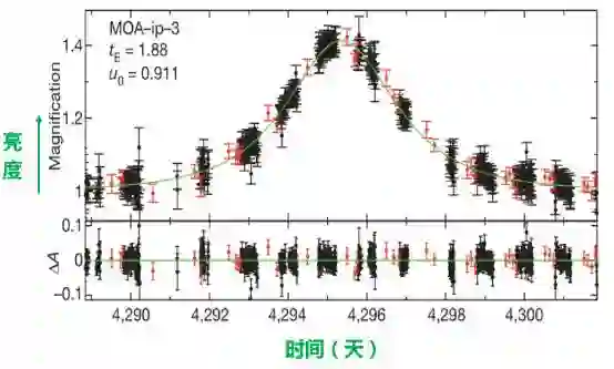 ► 图5. MOA-ip-3:MOA发现的10个流浪行星候选者中的一个,时标tE=1.88天。黑色数据点来自与MOA,红色数据点来源于OGLE(Optical Gravitational Lensing Experiment),绿色实线是最佳拟合理论曲线 (图片来源:文献[4])。
