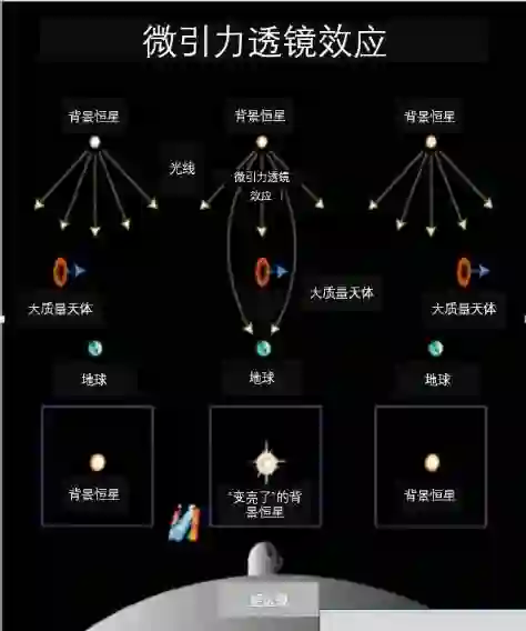 当我们观测遥远的恒星时,如果中间有其它恒星或行星穿过,这些过客(我们称之为透镜天体)的引力作用,会像凸透镜一样将光线汇聚,导致观测的恒星亮度增加(如图2所示),这就是微引力透镜效应。