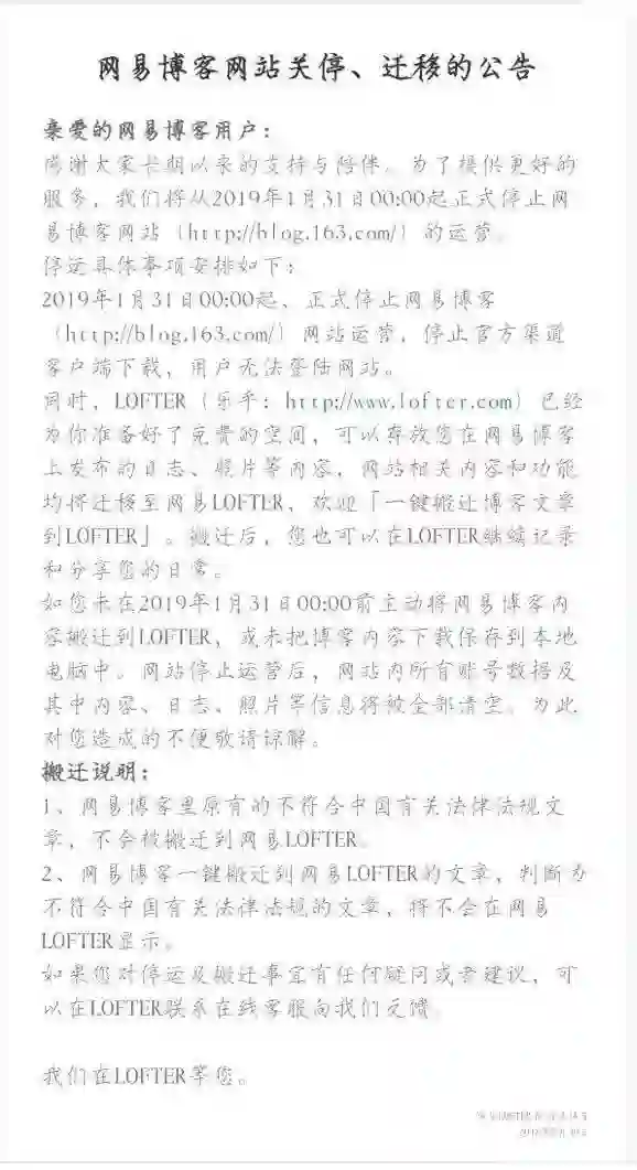 网易博客公告表示,将于2018年11月30日00:00起正式停止网易博客运营。停运具体事项安排为,2019年1月31日00:00起,正式停止网易博客网站运营,停止官方渠道客户端下载,用户无法登陆网站。并表示可以将日志内容一键搬迁至网易旗下轻博客品牌Lofter(乐乎)。