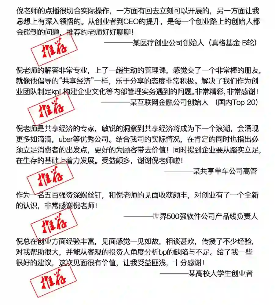 近几年,他为超过百家早期创业公司提供过顾问咨询服务,并担任共享单车、生鲜电商、智能家居、互联网金融、建材电商、K12公司、创业服务机构等多家从天使、A轮到上市公司的常年顾问。在多年的实战中,他形成了一套自己的、完整的创业实干理论。