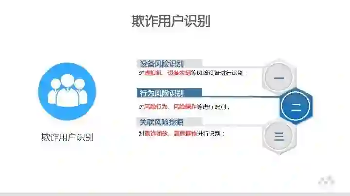 欺诈用户识别主要应用于业务流程的设备启动与注册环节,分为设备风险识别、行为风险识别、关联风险识别。