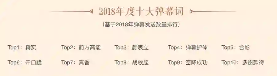 在按照发送数量排行的年度十大弹幕词中,排名2~10位的分别是前方高能、颜表立、弹幕护体、合影、开口跪、真香、战歌起、空降成功、多谢款待。