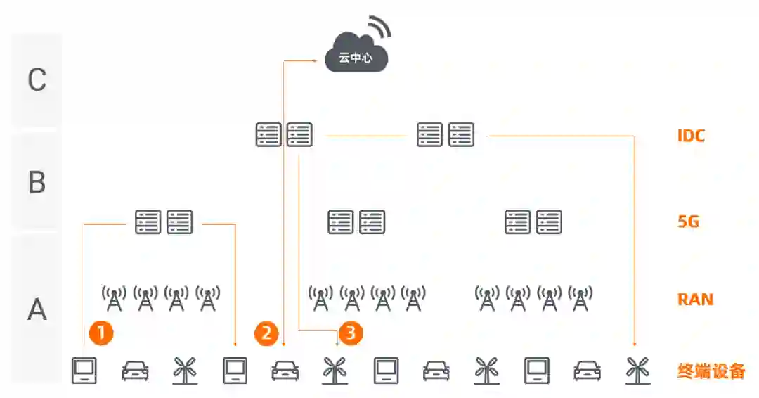 5G,让边缘计算继续下沉延伸到运营商地市城域网,将来会连接着数以万计的MEC节点,这是第二层边缘计算分布节点,提供小微规模集中算力,用于覆盖地市一级的就近计算和流量调度。因为MEC节点距离终端更近了一步,更低的时延和更低的成本,让更多原本只能在终端进行的计算能够上移至边缘,从而形成算力集约,最终带来成本收益。而且,5G释放出来更多的终端到边缘之间的网络传输质量管控能力,可以让我们基于场景来优化“端-边”的网络服务质量,达到降低成本的同时并未降低用户体验。