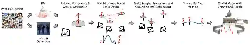 首先,对某个场景的图片集使用SfM来获得相机参数和稀疏的结构,随后在图片中检测2D的人体躯干点,并且估计每个人相对相机的距离和旋转角以及全局的重力向量。接着对一系列重建场景的可能尺度做彻底的检验,进行排序并近似地语义三角测量。然后进行尺度的精调,用已知的人体身高统计信息和局部地面放置3D人体。最后,用泊松表面重建法恢复地面。为了可视化,放置到3D场景中的人体衣物颜色是从图像中采集的,同时地面的纹理也用图像和语义像素标记来渲染。
