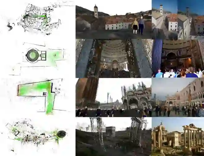 近年来,虚拟漫游系统变得流行起来,允许用户体验和探索他们没有到过的地方(如Google Earth VR)。这些应用使用了3D重建的方法来建立真实场景的模型。虚拟场景的感知体验固有地与重建结果的完整性有关,当前,地面重建和瞬态物体建模是大尺度场景重建的两大难点。由于相对少的地面匹配点,地面重建通常比较困难,而瞬态物体的放置比如移动的人和车无法用多视图同步也同样困难。此外,自动地恢复大场景的绝对尺度在缺少GPS信息的(室内或建筑密集等)情况下也存在问题。在本文中,作者致力于增强SfM + MVS的重建结果,尤其是从互联网图片集中重建3D场景,并且把从单张图片中检测到的人放置到场景中。图1展示了地面重建和3D场景中的人体放置。