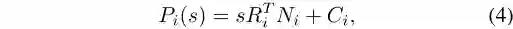 此时已经获得了人相对相机的绝对深度的初始估计,接下来要估计每个躯干放置到重建空间中的初始位置,同时需要获得初始的场景绝对尺度。如果场景尺度已知,就可以用式(4)计算脖子在重建场景空间中的3D位置。其中N为脖子相对相机的3D位置,R为场景到相机的旋转矩阵,C为重建空间中相机的位置。