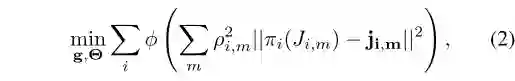 通过最小化躯干模型到原始图像的重投影误差来同时优化重力向量g和每个人 i 的位姿Θ = {(θi, xi, yi, zi)}。如式(2)所示,其中 j 为检测到的关节m的2D像素坐标,J为3D关节坐标 π() 是投影函数,ρ是关节检测置信度。