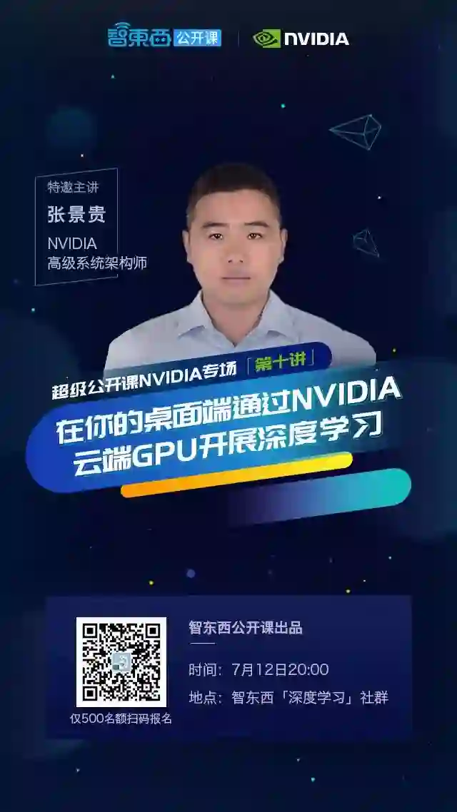7月12日晚上8点,NVIDIA高级系统架构师张景贵将来到智东西「深度学习」社群为大家带来主题为《在你的桌面端通过NVIDIA云端GPU开展深度学习》的讲解,循序渐进,让你学会通过NGC进行深度学习训练和推理。本课是智东西公开课推出的超级公开课NVIDIA专场的第十讲;第十一讲将于7月24日由NVIDIA深度学习解决方案架构师罗晟主讲《疾病诊断领域的深度学习》。