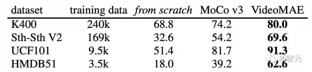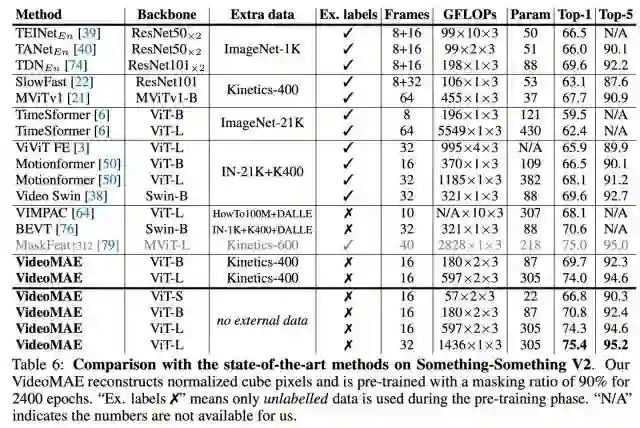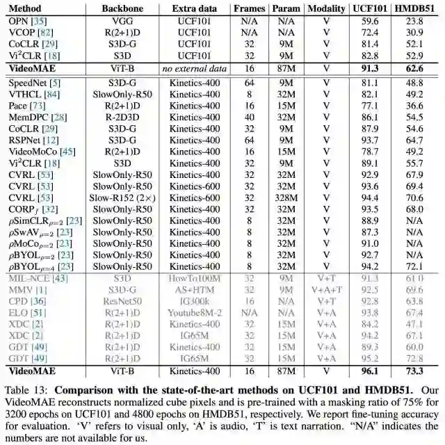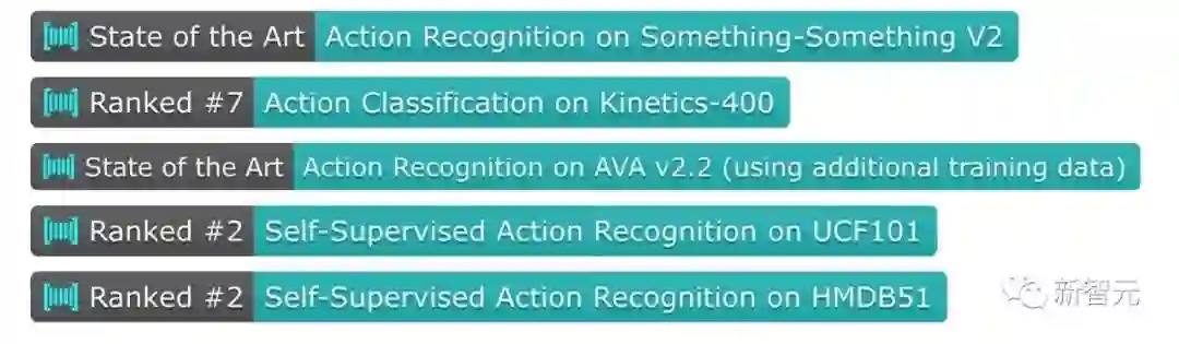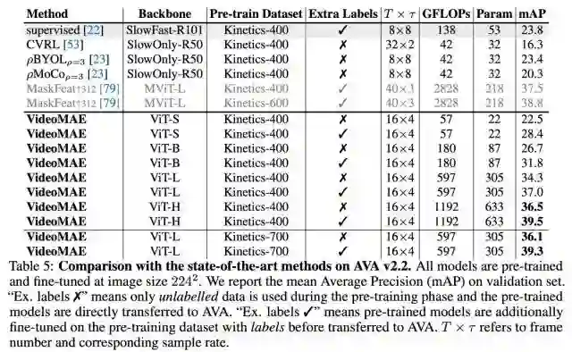 1. Action Recognition on Something-Something V2 https://paperswithcode.com/sota/action-recognition-in-videos-on-something?p=videomae-masked-autoencoders-are-data-12. Action Detection on AVA v2.2 https://paperswithcode.com/sota/action-recognition-on-ava-v2-2?p=videomae-masked-autoencoders-are-data-13. Action Classification on Kinetics-400 https://paperswithcode.com/sota/action-classification-on-kinetics-400?tag_filter=1634. Self-Supervised Action Recognition on UCF101 https://paperswithcode.com/sota/self-supervised-action-recognition-on-ucf101?tag_filter=1635. Self-Supervised Action Recognition on HMDB51 https://paperswithcode.com/sota/self-supervised-action-recognition-on-hmdb51?tag_filter=163
