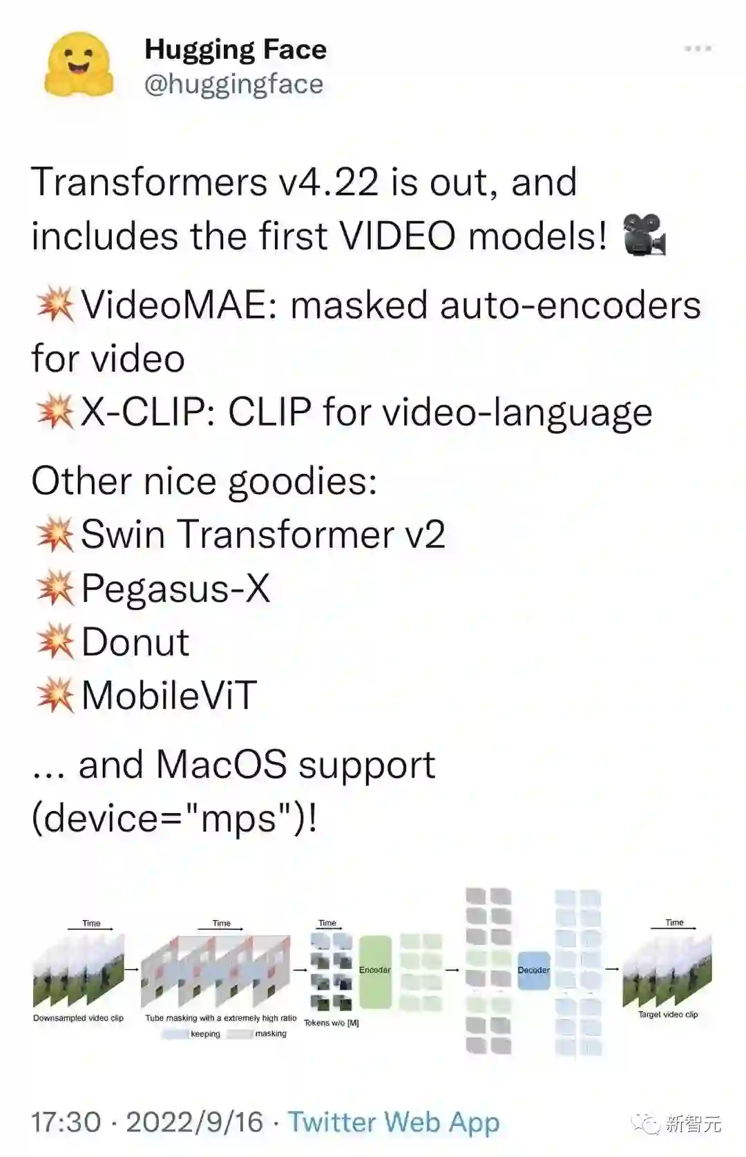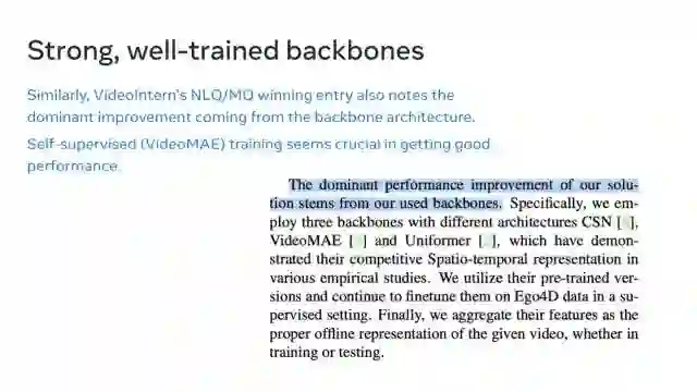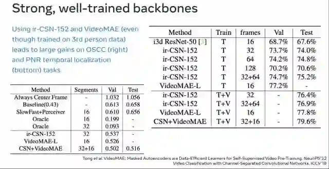 https://huggingface.co/docs/transformers/main/en/model_doc/videomae几个月前,VideoMAE的模型被Hugging Face的Transformers官方仓库收录,是该仓库收录的第一个视频理解模型!一定程度上也反应了社区对我们工作的认可!希望我们的工作能为基于Transformer的视频预训练提供一个简单高效的基线方法,同时也能为后续基于Transformer的视频理解方法带来启发。https://github.com/open-mmlab/mmaction2/tree/dev-1.x/configs/recognition/videomae目前视频理解仓库MMAction2也支持了对VideoMAE模型的推理。在刚刚结束的 ECCV 2022 2nd International Ego4D Workshop上,VideoMAE已经迅速成为了帮助大家打比赛的利器。上海人工智能实验室在本届Ego4D Challenge中的多个子赛道取得了冠军 。其中,VideoMAE作为重要的Backbone,为他们的解决方案提供了强大的视频特征。值得注意的一点是,从上面第一张图中可以发现,仅仅在Kinetics-400上进行预训练的VideoMAE(ViT-L)的效果已经可以超越在IG-65M视频数据集(约为Kinetics-400样本数据的300倍)上预训练的ir-CSN-152。这也进一步验证了VideoMAE预训练模型的强大表征能力。