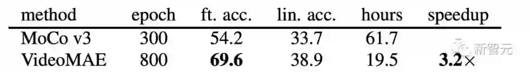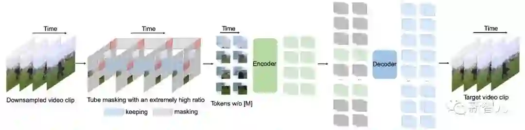 我们这个工作的主要贡献包含以下三个方面:• 我们第一个提出了基于ViT的掩码和重建的视频自监督预训练框架VideoMAE。即使在较小规模的视频数据集上进行自监督预训练,VideoMAE仍能取得非常优异的表现。为 了解决由时序冗余性 (temporal redundancy) 和时序相关性(temporal correlation) 导致的「信息泄漏」问题,我们提出了带有极高掩码率的管道式掩码(tube masking with an extremely high ratio)。实验表明,这种设计是VideoMAE 最终能够取得SOTA效果的关键。同时,由于VideoMAE的非对称编码器-解码器架构,大大降低了预训练过程的计算消耗,极大得节省了预训练过程的时间。• VideoMAE 将NLP和图像领域中的经验成功在视频理解领域进行了自然但有价值的推广,验证了简单的基于掩码和重建的代理任务可以为视频自监督预训练提供一种简单但又非常有效的解决方案。使用 VideoMAE 进行自监督预训练后的 ViT 模型,在视频理解领域的下游任务(如动作识别,动作检测)上的性能明显优于从头训练(train from scratch)或对比学习方法(contrastive learning) 。• 实验过程中还有两处有意思的发现,可能被之前NLP和图像理解中的研究工作忽视了: (1) VideoMAE是一种数据高效的学习器。即使在只有 3 千个左右的视频数据集HMDB51上,VideoMAE也能够完成自监督预训练,并且在下游分类任务上可以取得远超过其他方法的结果。(2) 对于视频自监督预训练,当预训练数据集与下游任务数据集之间存在明显领域差异(domain gap)的时候,视频数据的质量可能比数量更加重要。
