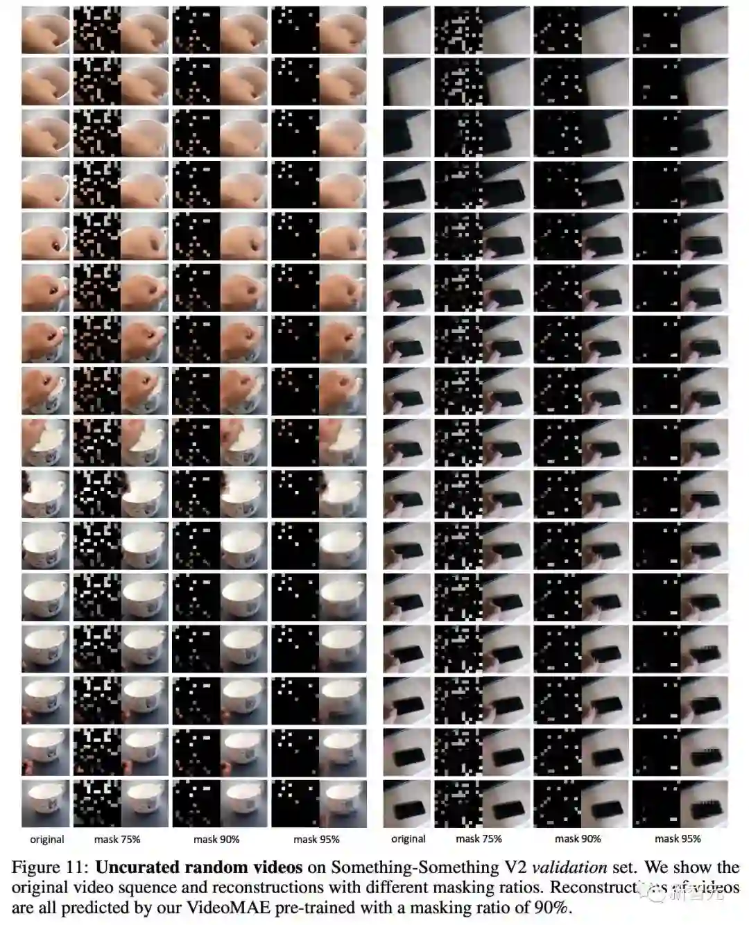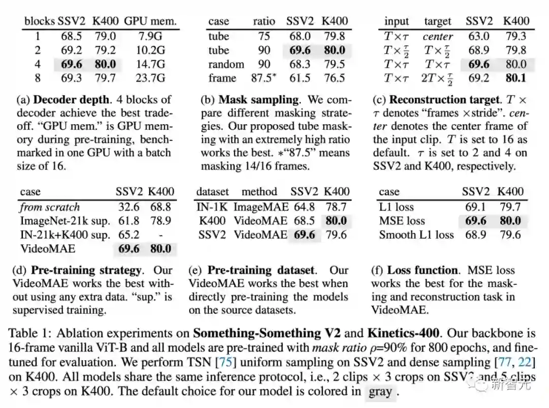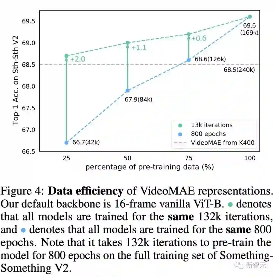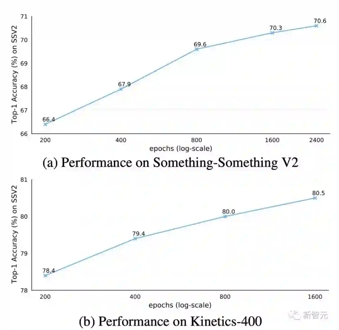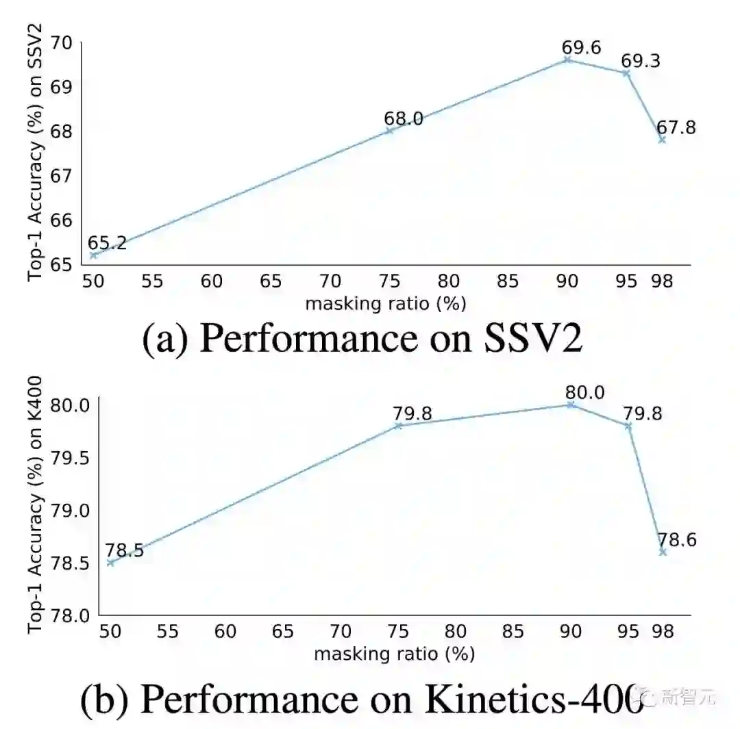 AVA v2.2数据集实验结果除了传统的动作分类任务,我们还进一步在视频动作检测这种更精细的理解任务上验证VideoMAE模型的表征能力。我们选取了AVA v2.2数据集进行实验。实验中,首先会加载Kinetics-400数据集上预训练好的模型,再对ViT进行有监督形式的微调。由表格可以发现,经过VideoMAE预训练的ViT模型可以在AVA v2.2数据集上取得非常好的结果。如果将自监督预训练后的ViT模型,在Kinetics-400上进行进一步的有监督的微调,可以在动作检测任务上去得更好的表现(3 mAP-6mAP的提升)。这也说明了对VideoMAE自监督预训练后的模型,在上游数据集进行有监督的微调后再迁移到下游任务中,模型的性能可以进一步提升。