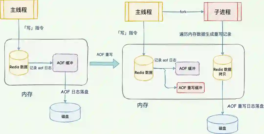 Redis 会将重写过程中的接收到的「写」指令操作同时记录到旧的 AOF 缓冲区和 AOF 重写缓冲区,这样重写日志也保存最新的操作。等到拷贝数据的所有操作记录重写完成后,重写缓冲区记录的最新操作也会写到新的 AOF 文件中。