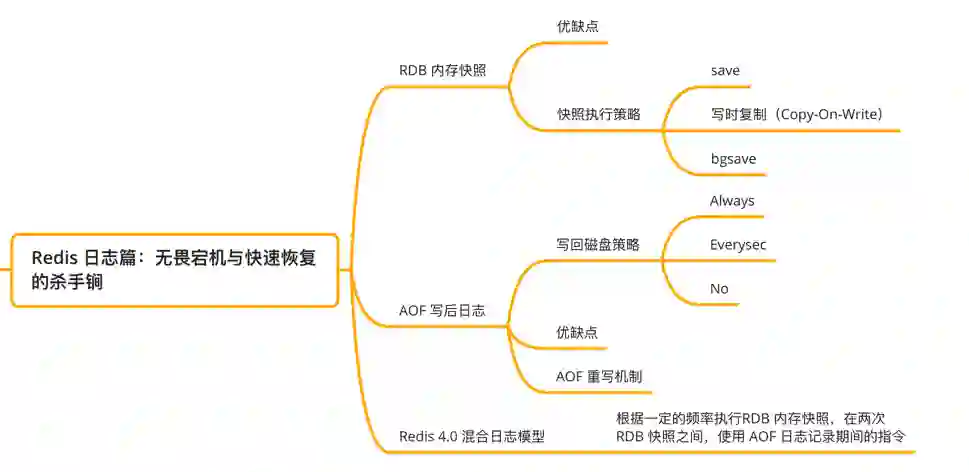 Redis 系列篇章围绕如下思维导图展开,这次从 《Redis 日志篇:无畏宕机与快速恢复的杀手锏》一起探索 Redis 的高性能、持久化机制的秘密。