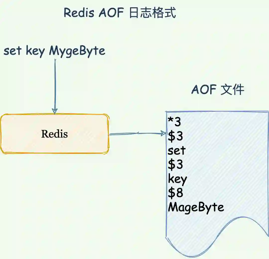 当 Redis 接受到 「set key MageByte」命令将数据写到内存后,Redis 会按照如下格式写入 AOF 文件。