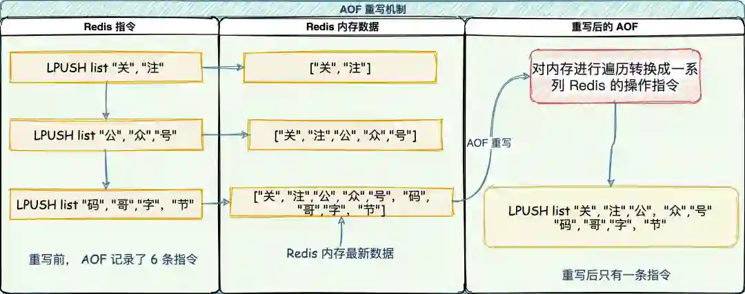 重写机制有「多变一」功能,将旧日志中的多条指令,在重写后就变成了一条指令。