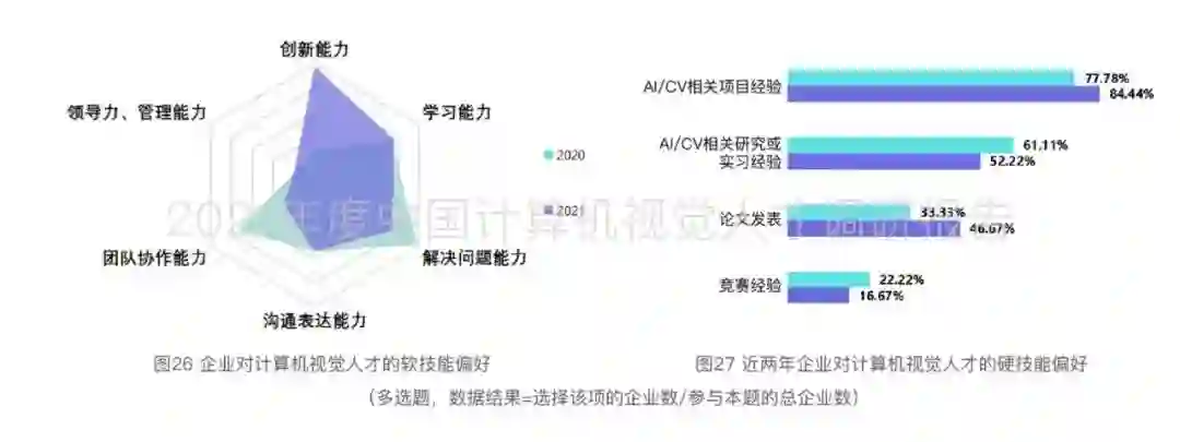 在软技能要求方面,与2020年调研结果对比显示,企业越来越关注人才的创新能力。在计算机视觉领域,企业更加期望通过人才的创新能力帮助其快速实现技术创新与突破、抢占时代发展制高点、实现在行业中的技术领先地位,从而拓展其业务规模和经济收益。