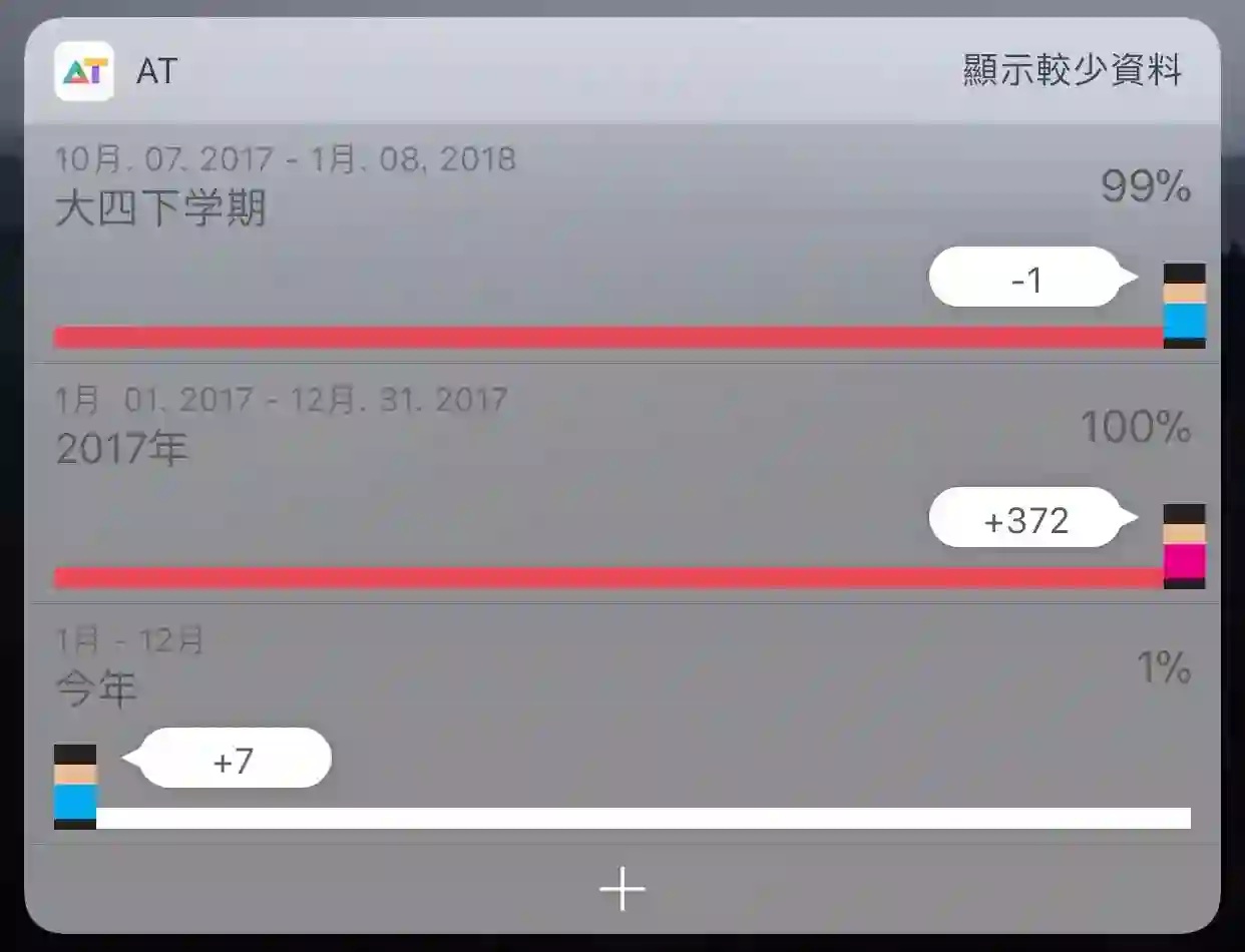 AT 日期追踪是一款设计精良的时间管理软件,通过你的任务设定,它能以直观的方式为你展示离任务的最后期限还有多久。同样地,你也能设置某段经历的起始时间,如:大四第二学期、2018 年,它能告诉你每一天在这段经历的哪个位置,让你更好的管理时间,日程和任务。