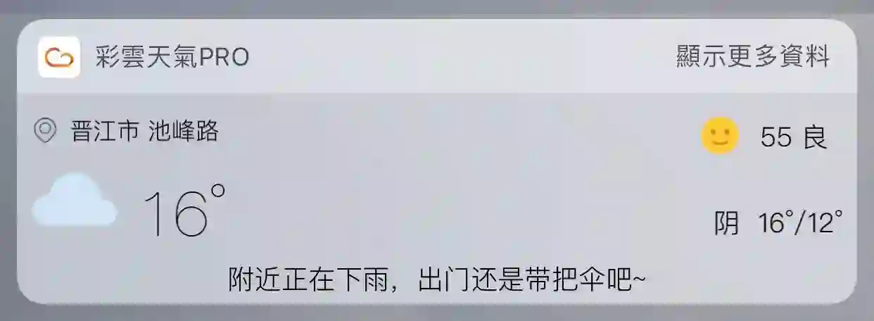 「彩云天气」的小部件不仅能实时为我提供我所在街道的天气情况,还能实习更新降雨预测,如:「30 分钟后雨渐小,转为小雨」,对自己出行起到了一定的帮助。