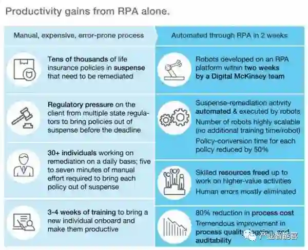 这就是智能流程自动化(IPA)的地方。我们相信它将成为公司下一代运营模式的核心部分。许多跨行业的公司都在试验IPA,结果令人印象深刻: