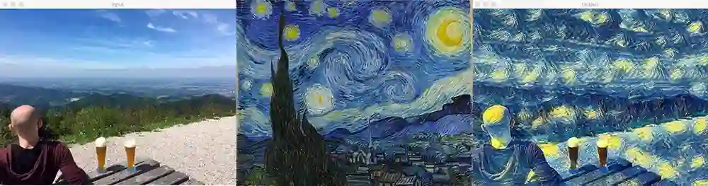 上图就是将梵高著名的画作《星夜》的风格应用到普通的生活照上,我们保留了原照片中的山、人物和啤酒等所有内容,但全部替换成了梵高的油画风格。