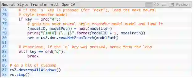 如果用户按下“n”键,我们将把迭代器循环运用到下一个神经风格迁移模型上,不用重启脚本。