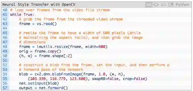 2015年,Gatsys等人在论文A Neural Algorithm of Artistic Style中提出了最初的神经风格迁移算法。2016年,Johnson等人发表了Perceptual Losses for Real-Time Style Transfer and Super-Resolutioin一文,将神经网络迁移作为用感知损失处理超分辨率问题的框架。结果表明该算法比Gatys等人的方法快了三倍。接下来,我将介绍如何在自己的图像和视频流中应用神经风格迁移。