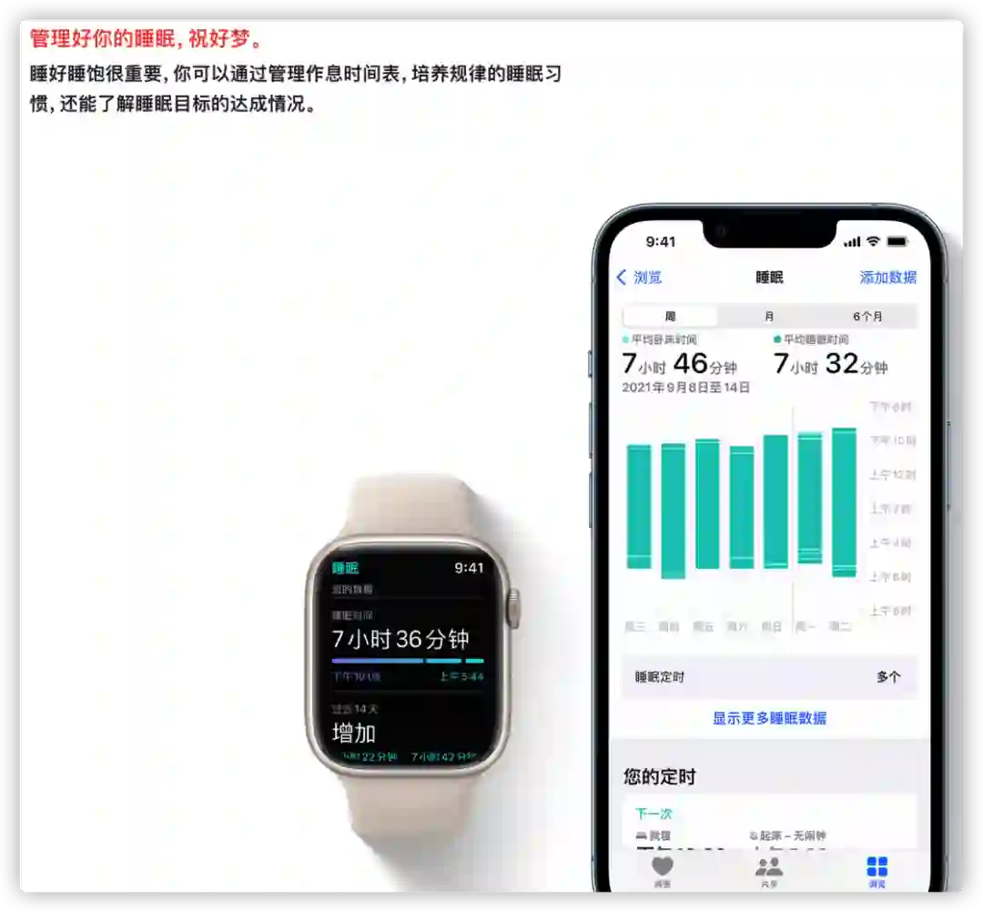 只需设置希望的每夜睡眠时长,「时钟」应用便可提醒您就寝,并通过播放闹钟来唤醒您。
