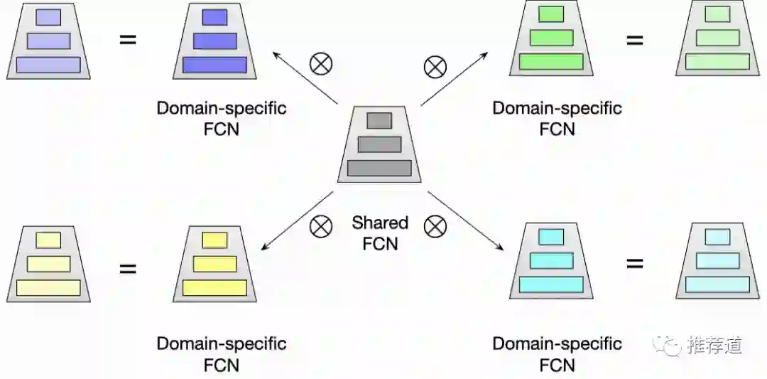 一篇是《One Model to Serve All: Star Topology Adaptive Recommender for Multi-Domain CTR Prediction》。这篇文章研究的是,如何训练并部署一个模型,就能胜任“首页推荐”、“猜你喜欢”等多个领域。前两个改进也很“直觉”(嘿嘿,知道我模仿的是谁吗?)