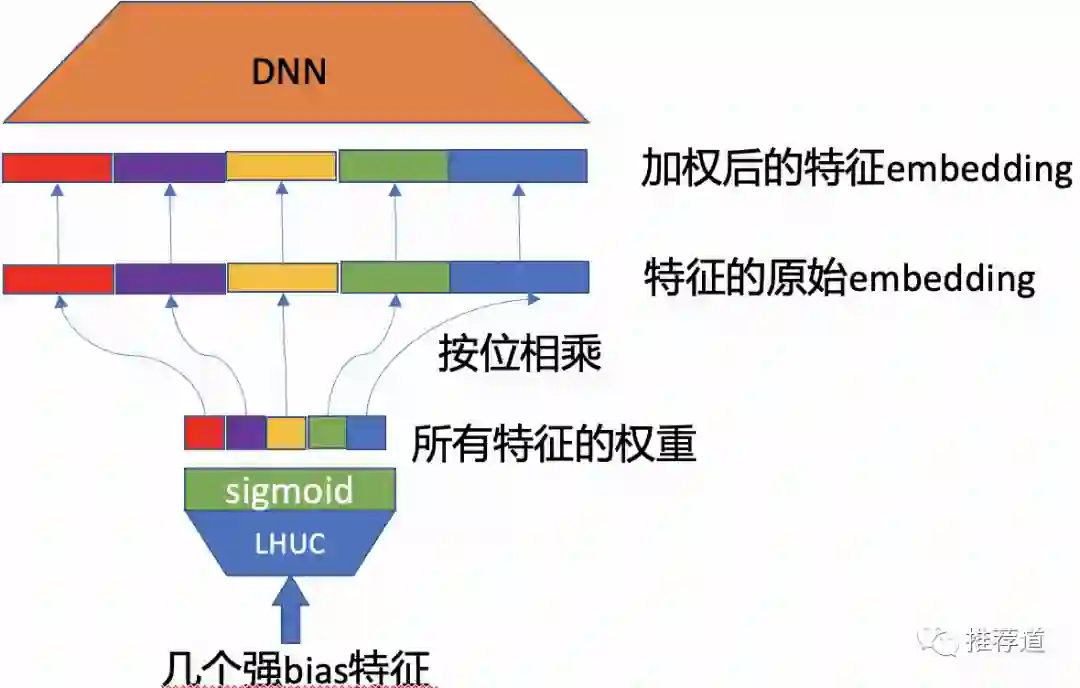 方法二,将这些强bias的特征,喂入SENet或或LHUC(Learn Hidden Unit Contribution,如下图所示),用来决定其他特征的重要性
