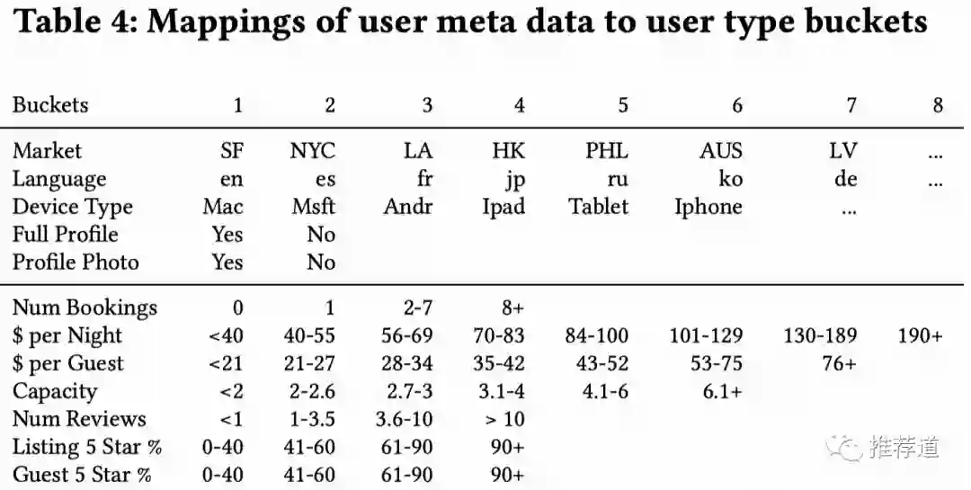 既然user id embedding那么重要,而新用户的user id embedding质量却那么差(训练时得到的随机向量,预测时得到的是全0向量),那么能不能找到一个替代方案?这时,Airbnb的经典文章《Real-time Personalization using Embeddings for Search Ranking at Airbnb》给我提供了一种思路。在Airbnb的实践中,由于booking这个行为太稀疏,所以绝大多数用户都是“新用户”,而Airbnb的思路就是根据规则将用户划分为若干用户组(比如,“讲英语,使用苹果手机”的用户群,和“讲西班牙语,使用Android手机”的用户群),然后用user group embedding代替单独的user id embedding参与后续训练与预测。