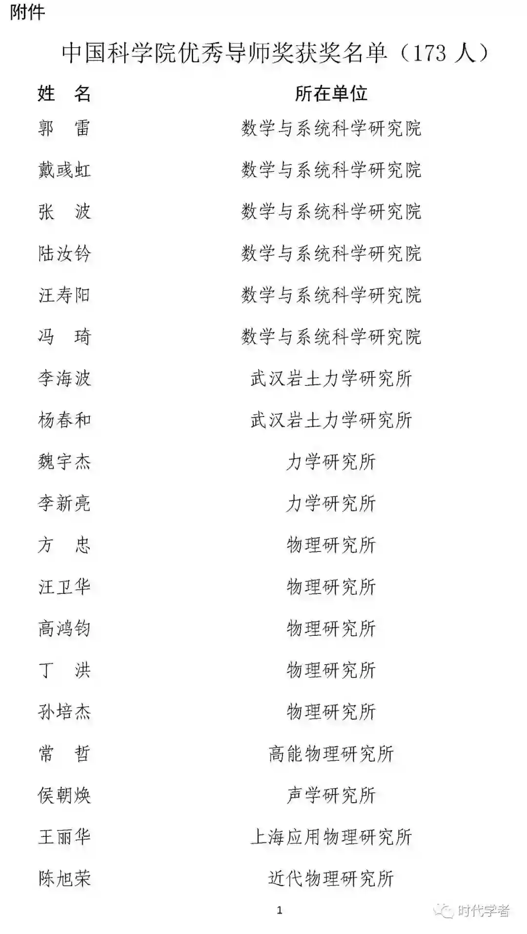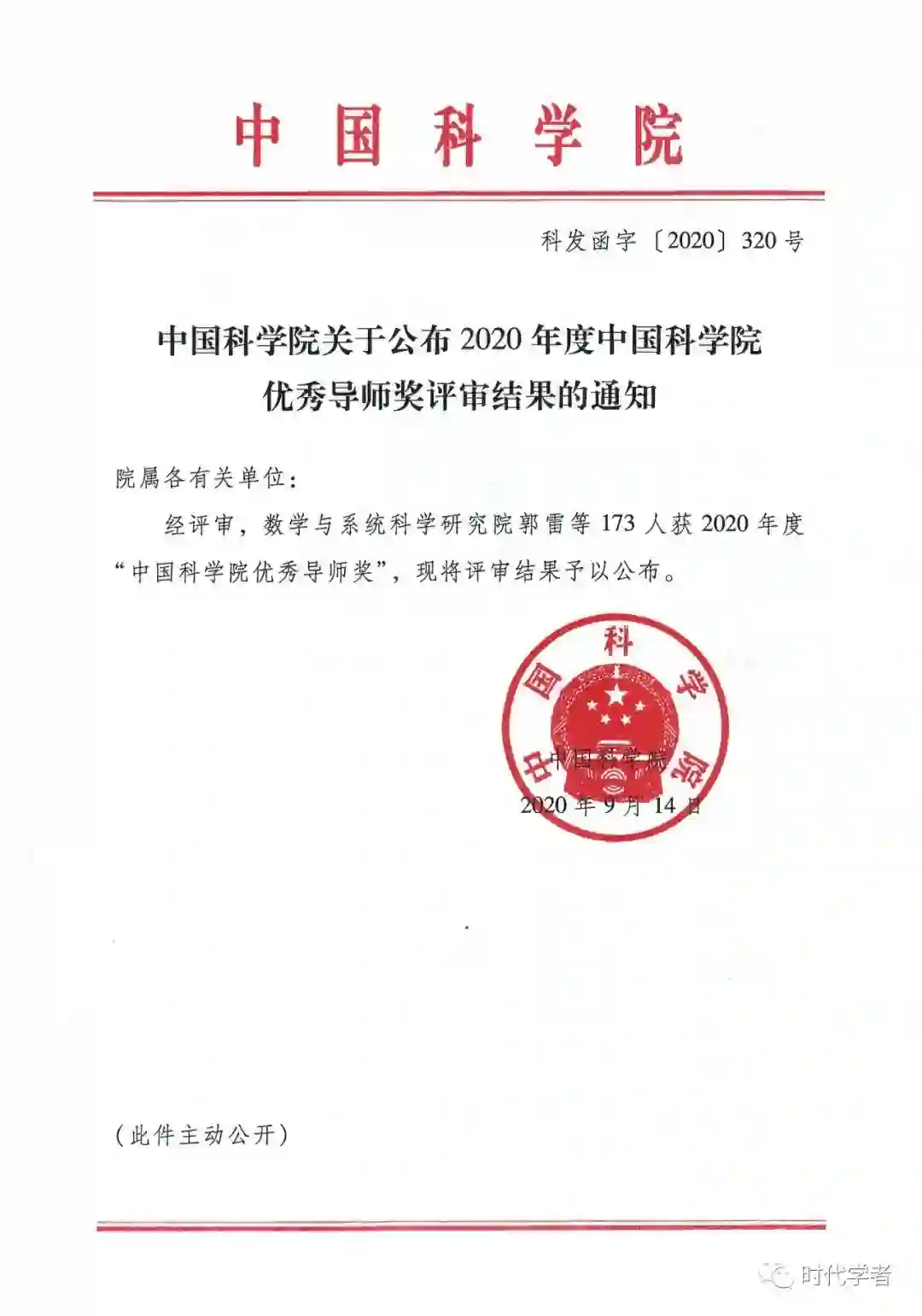 经评审,数学与系统科学研究院郭雷等173人获2020年度“中国科学院优秀导师奖”,现将评审结果予以公布。