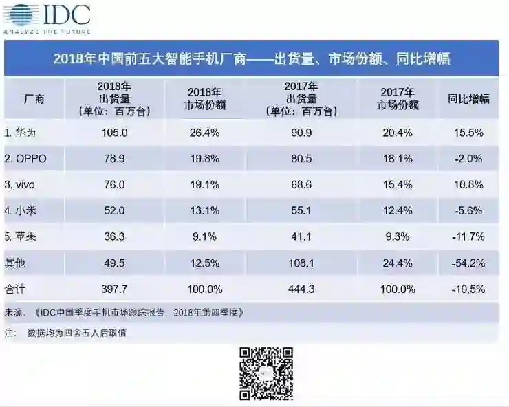 近日,IDC数据显示,2018年全年市场总出货量从2017年4.44亿部,降至3.98亿部,降幅达到10.5%。2018年全年,华为、OPPO、vivo、小米、苹果分别位列手机出货量前五名。市场份额分别为26.4%、19.8%、19.1%、13.1%、9.1%。华为、vivo分别同比增长15.5%、10.8%,OPPO、小米、苹果分别有所下滑,其中苹果同比跌幅最大为-11.7%。