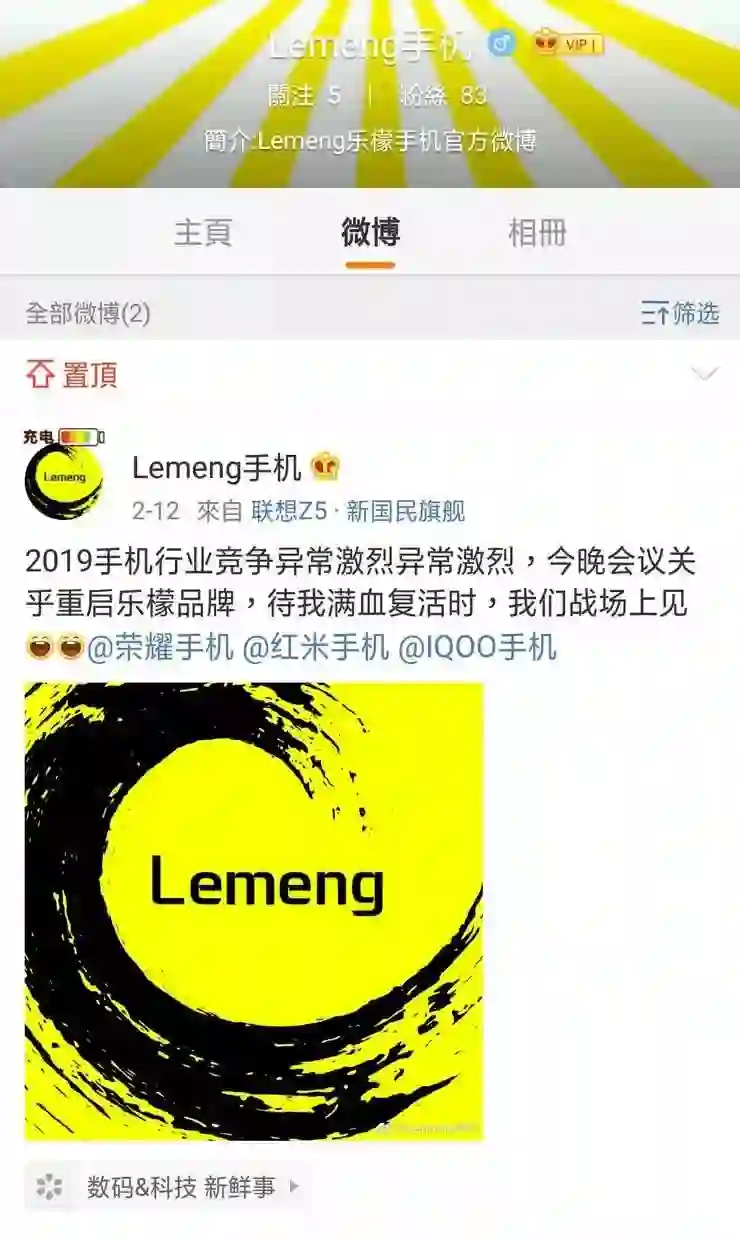 早在前几天,2月12日,该微博@Lemeng手机就更新了第一条消息,内容显示,2019年手机行业竞争异常激烈,今晚会议关乎重启乐檬品牌,待我满血复活时,我们战场上见。并@荣耀手机、红米手机、IQOO手机。由于“动静”较小,当天很多人并未关注到此条消息。截至雷锋网发稿,该条微博一直处于置顶状态。
