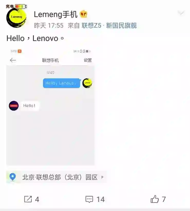 2月13日下午,一疑似联想乐檬手机@Lemeng手机的微博,更新状态与联想手机微博互动。且坐标定位为北京联想总部北京园区。微博基本资料显示,该微博注册时间为2019年1月25日,公司为联想集团,生日1999年11月2日,天蝎座。