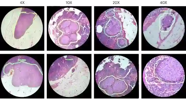 AI 科技评论注:通过增强现实显微镜观察到的视图。这些图像展示了 4x、10x、20x 和 40x 放大倍数下的淋巴结标本。