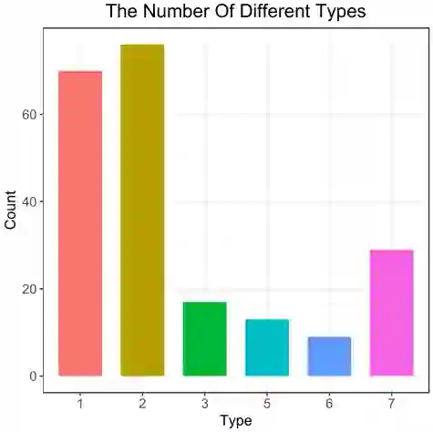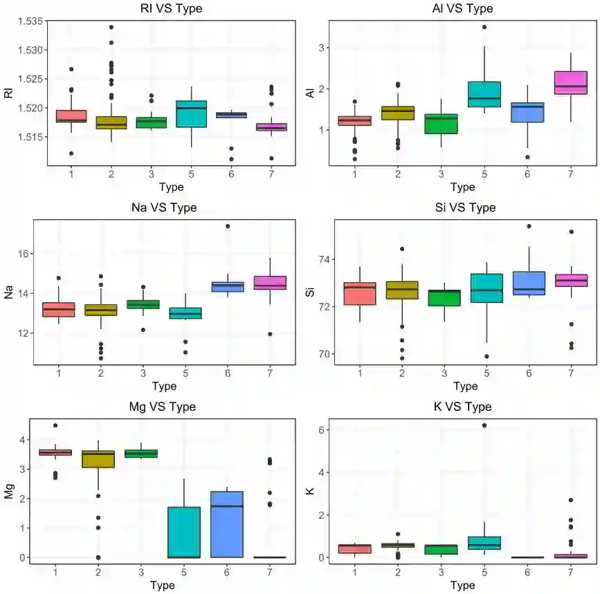 看到这个图,想必上面关于类别的疑问也就得到答复了:一共6类,而且类别不平衡。到这里不得不说一句,其实如果想简单粗暴的查看类别的信息,可以直接使用table(glass$Type)去统计,但是呢,表现出来的效果不同,不同场合使用不同的方式才使最好的。接下来就使用箱线图去探索一下每个自变量与因变量的关系。