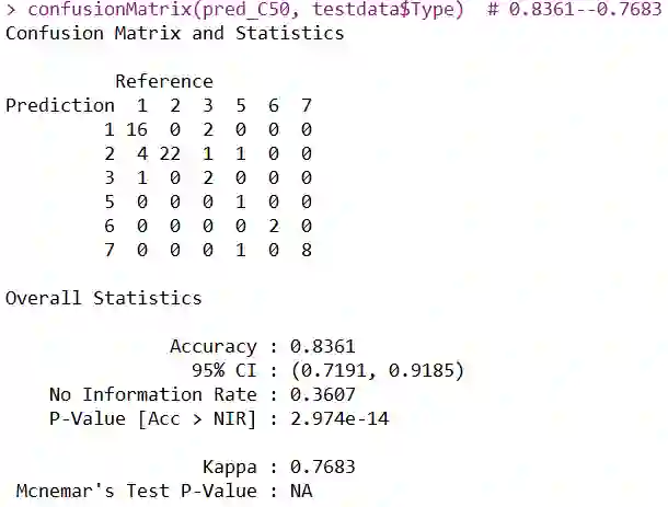 model_C50 <- train(Type ~., data = traindata, method = 'C5.0', trControl = ctrl)