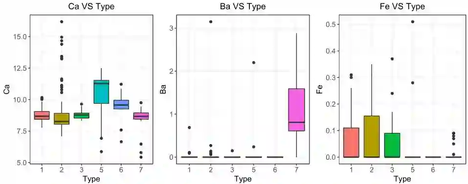 通过这几个图呢,大致能看出不同的类别中不同元素和折射率的分布情况。从一定程度上而言,变量分布差距越明显,那么用该变量就更容易区分类别。再次声明:本人不是从事玻璃行业的,不清楚业务问题,所以就不进行“异常值”的处理了,后续直接建模......