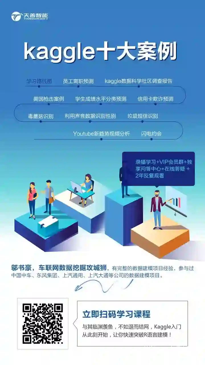 注:本案例不提供数据集,如果要学习完整案例,点击文章底部阅读原文或者扫描课程二维码,购买包含数据集+代码+PPT的《kaggle十大案例精讲课程》,购买学员会赠送文章的数据集。