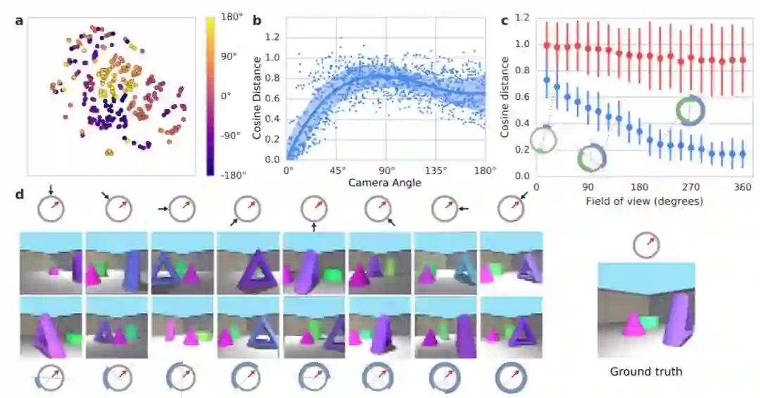 图 6:a) 单个描述编码的 t-SNE,根据不同摄像机角度着色。b) 同一场景单个描述表征之间的距离,是视点之间角度的函数。c) 从相对弧绘制的聚合表征之间的距离,是这些弧的大小的函数。蓝色对比相同场景表征,红色对比不同场景表征。d) 在不同的输入条件下,恒定场景和坐标的输出样本。顶部:单个描述(黑色箭头方向),底部:来自越来越大的弧的聚合描述。