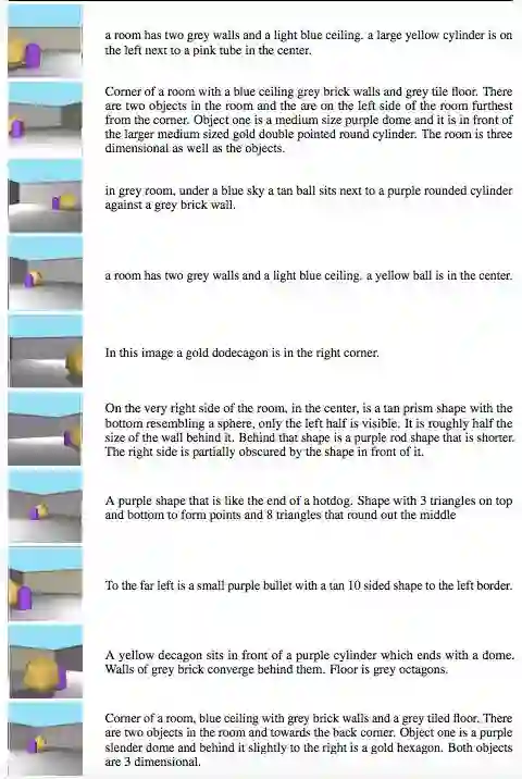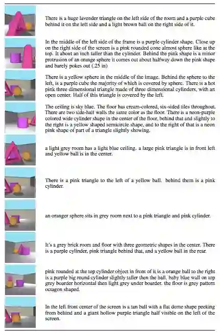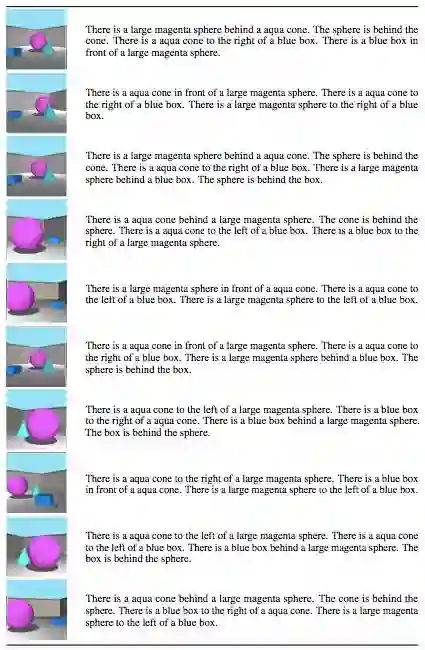 我们认为,朝人类水平的理解场景描述能力发展的重要一步是建立能够捕捉这些不变性的表征。在本文中,我们介绍了一个能学习此类表征的多模态架构。为了训练和验证该模型,我们创建了一个 3D 场景的大型数据集,包括场景和不同角度的语言描述。我们对学到的表征进行评估,通过从训练数据中未看到的角度生成图像并检查它们是否符合这种新角度下对场景的自然语言描述,来确保它们确实能够泛化。我们还发现,我们学习的表征很符合人类关于场景描述的相似性判断。