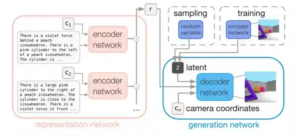 图 2:模型图示。表征网络解析多个摄像机坐标拍摄的多视点场景的多个描述和文本描述。所有视点的表征被聚合成一个场景表征向量 r,然后生成网络使用该向量 r 来重建从新的相机坐标看到的场景的图像。